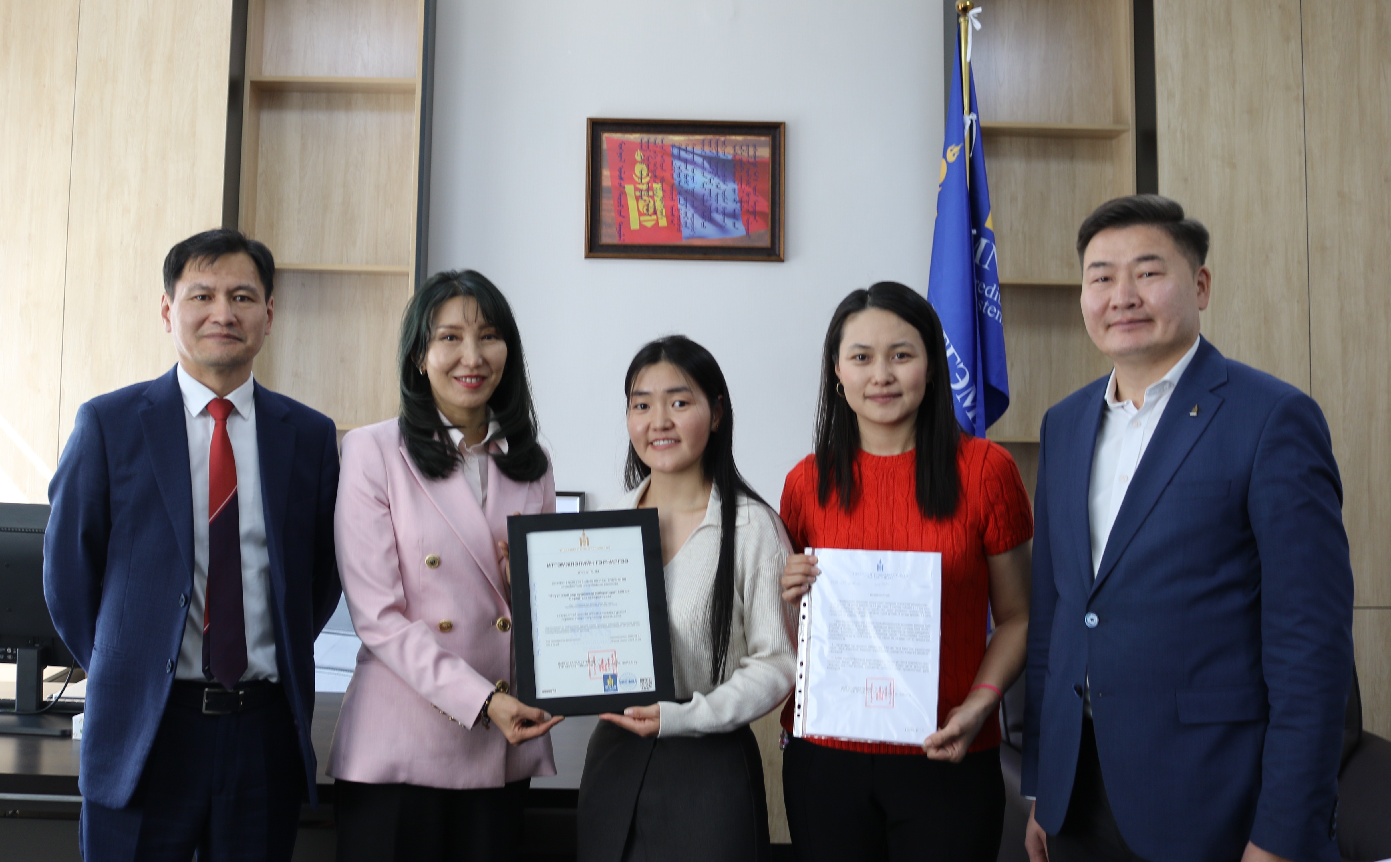MNS ISO/IEC 17025:2018 “Сорилтын болон шалгалт тохируулгын лабораторийн чадавхад тавих шаардлага” стандартын шаардлага, шалгуурыг ханган итгэмжлэгдсэн дараах лабораториудад Үндэсний Итгэмжлэлийн төвийн даргын албан үүргийг түр орлон гүйцэтгэгч Ж.Чойханд, Захиргаа, удирдлагын газрын дарга Э.Магнайбаяр, Бодлогын хэрэгжилтийг зохицуулах газрын дарга З.Мөнхбат нар итгэмжлэлийн гэрчилгээг гардууллаа.